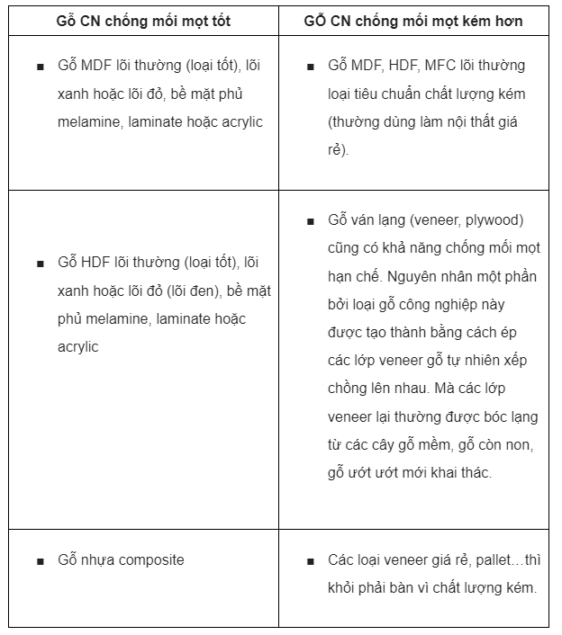Trong thành phần của gỗ công nghiệp có chứa các loại keo, hóa chất phụ gia có khả năng chống mối mọt. Nhưng không phải loại nào cũng giống nhau. Gỗ ván ép hay gỗ ghép thanh thường được tạo nên từ gỗ tạp, rất hấp dẫn với mối mọt. Mặt khác, qua thời gian sử dụng, các hóa chất cũng dần biến đổi, tạo cơ hội cho mối một tấn công.