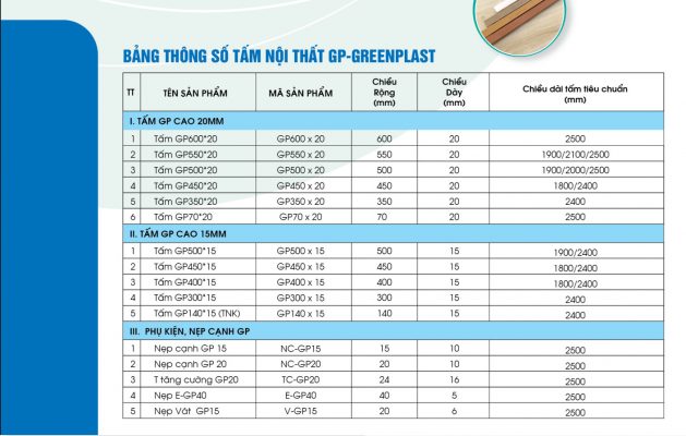 Thông số của tấm nội thất nhựa GP – GreenPlast